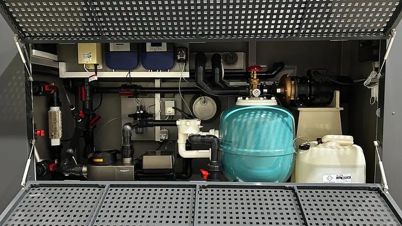 Además, incluye una bomba de calor para mantener la temperatura del agua ideal durante todo el año, y un sistema de aislamiento térmico que limita la pérdida de calor.